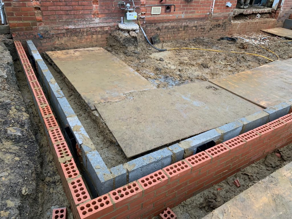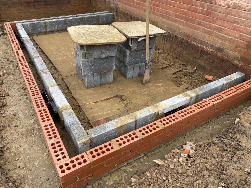 Meanwhile, the whole rear and front extension are engineered out of the ground to block and beam level. A sterling effort here from our two bricklayers who between them in a day have laid 700 engineering bricks and 260 concrete blocks. All set up, levelled, lasered and looking perfect.